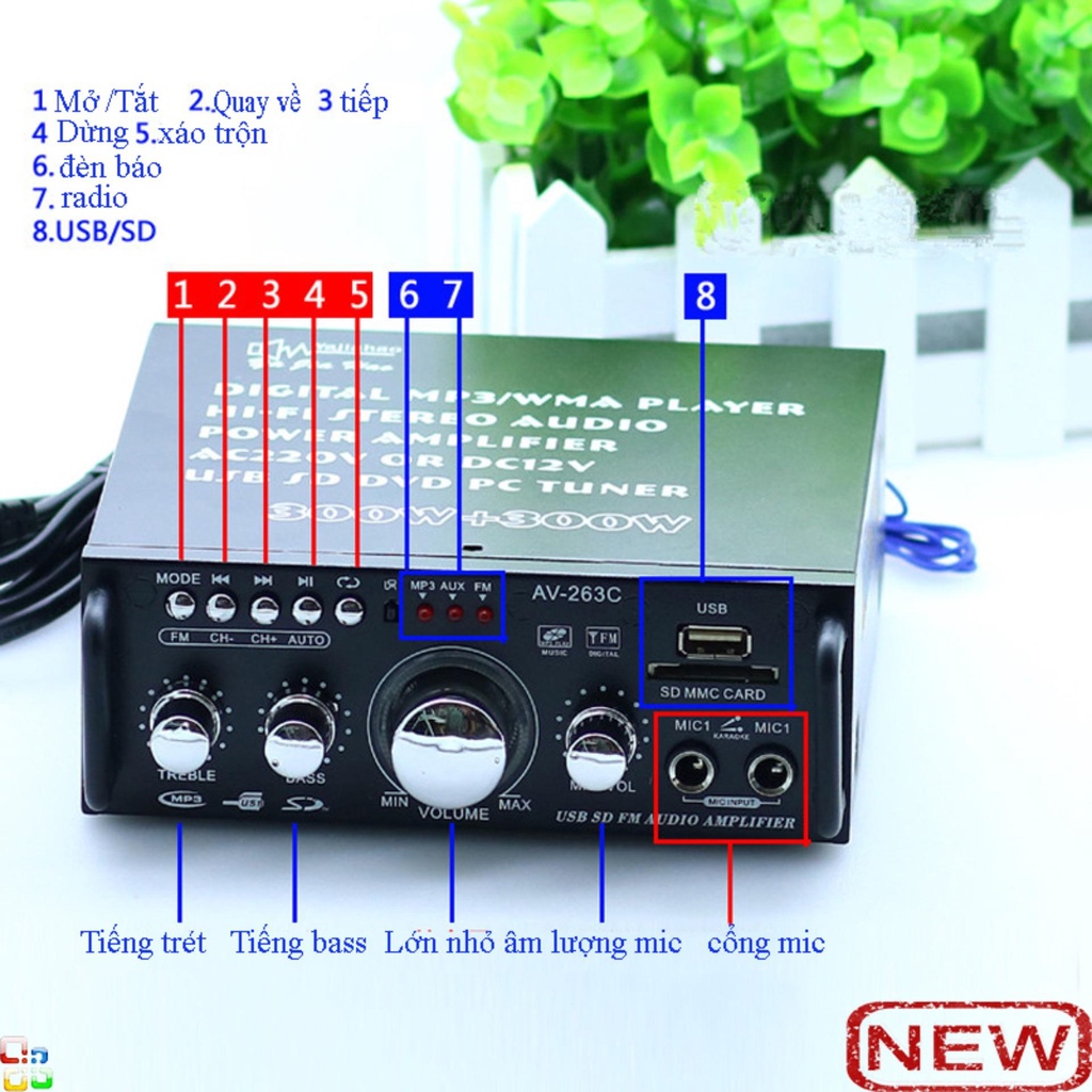 - Các tính năng: chạy thẻ nhớ / USB / điều khiển từ xa /thu sóng FM radio / Micro/ hỗ trợ điều chỉnh reverb, vang