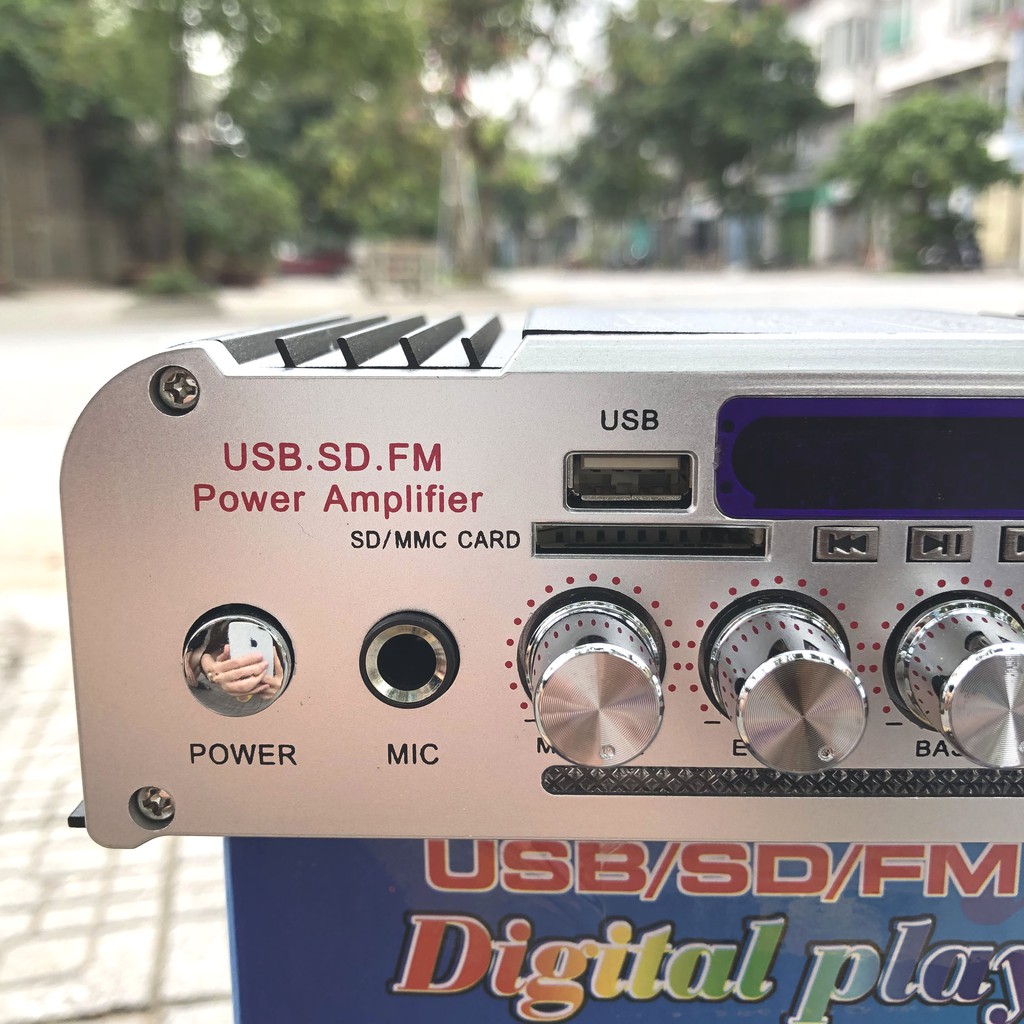 - Các tính năng: chạy thẻ nhớ / USB / điều khiển từ xa /thu sóng FM radio / Micro/ hỗ trợ điều chỉnh reverb, vang