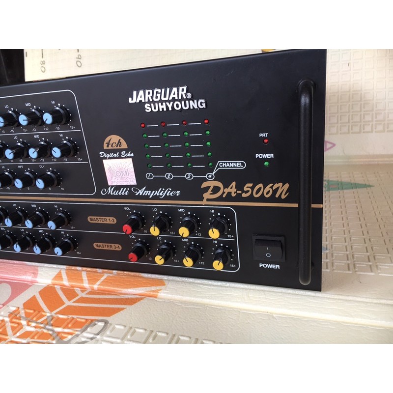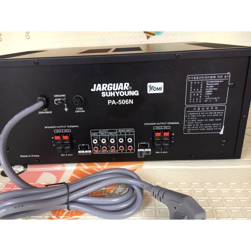 Amply 506N 8 sò Toshiba nhập khẩu TQ, hàng chuẩn,chất lượng âm thanh echo rất mượt, không thua kém gì hàng xịn, 4 kênh riêng biệt, công suất khỏe. Từ khi ra đời đến nay, Amply Jarguar Suhyoung PA-506N đã thỏa mãn yêu cầu của những người đam mê âm nhạc. Nó đáp ứng được tất cả mọi yêu cầu khắt khe nhất của một hệ thống karaoke tối tân.JG Suhyoung PA-506N cho công suất khỏe, với công suất đầu ra lên tới 520W. có thể dùng cho 2 đôi loa bass 25cm hoặc bass 30cm.