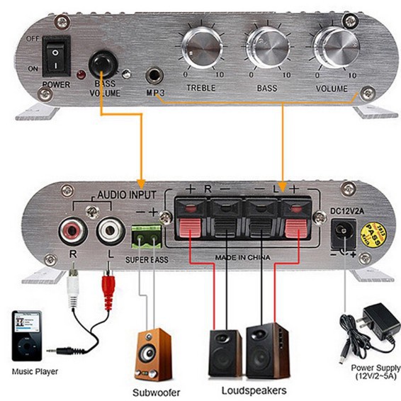 - Ampli 12V sử dụng nguồn trực tiếp từ xe hơi hay adapter 12V.