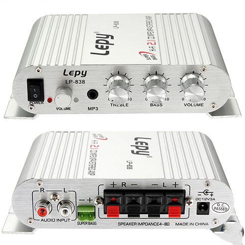 Ampli mini công suất Lepy LP-838 12V Hi-Fi 2.1 là bộ khuếch đại âm thanh nhỏ gọn dành cho xe hơi, xe máy hay phòng nghe nhạc gia đình.TÍNH NĂNG AMPLI MINI LEPY LP-838