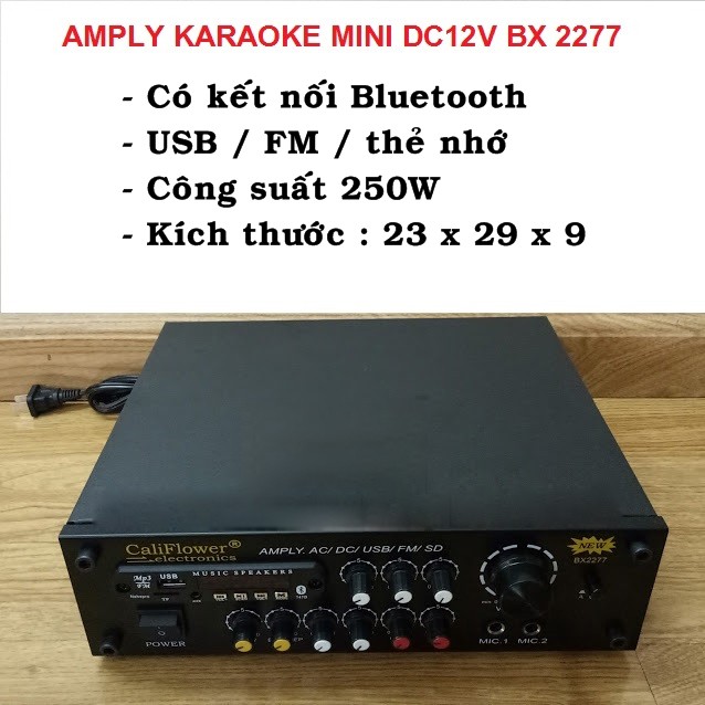 Mô tả Amply mini AC / DC 12V bluetooth / USB / thẻ SD / Radio CALIFLOWER BX2277Nguồn AC hoặc DC 12V