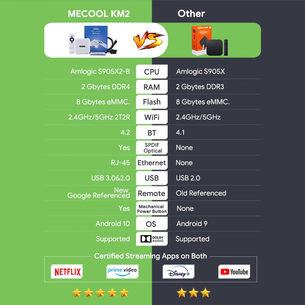 Mecool KM2 là một TV Box mới nhất của hãng Mecool, chạy trên Hệ Điều Hành Android TV 10 OS có chứng chỉ Google (CE). Thiết bị hỗ trợ Voice giọng nói với Google Assistant, tích hợp Chromecast. Bên cạnh đó, Mecool KM2 có các chứng nhận hàng đầu từ các hãng cung cấp nội dụng lớn: Google, Netflix 4K, và Prime Video.Mecool KM2 có thể streaming video hiển thị lên đến 4K@60fps từ các dịch vụ streaming phổ biến như: Disney +, HBO, v. v. . Thiết bị cũng hỗ trợ 4K HDR, HDR10, và Âm Thanh Dolby.