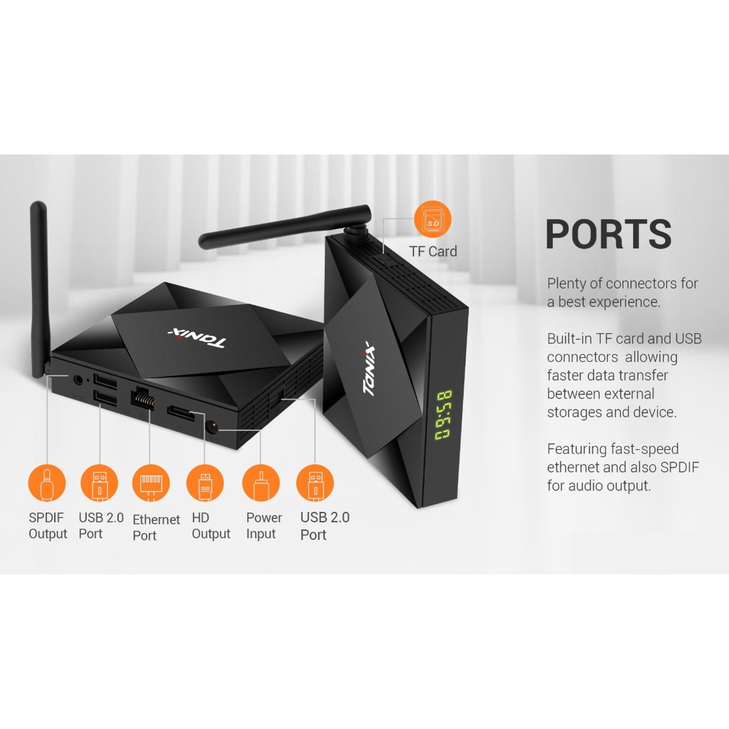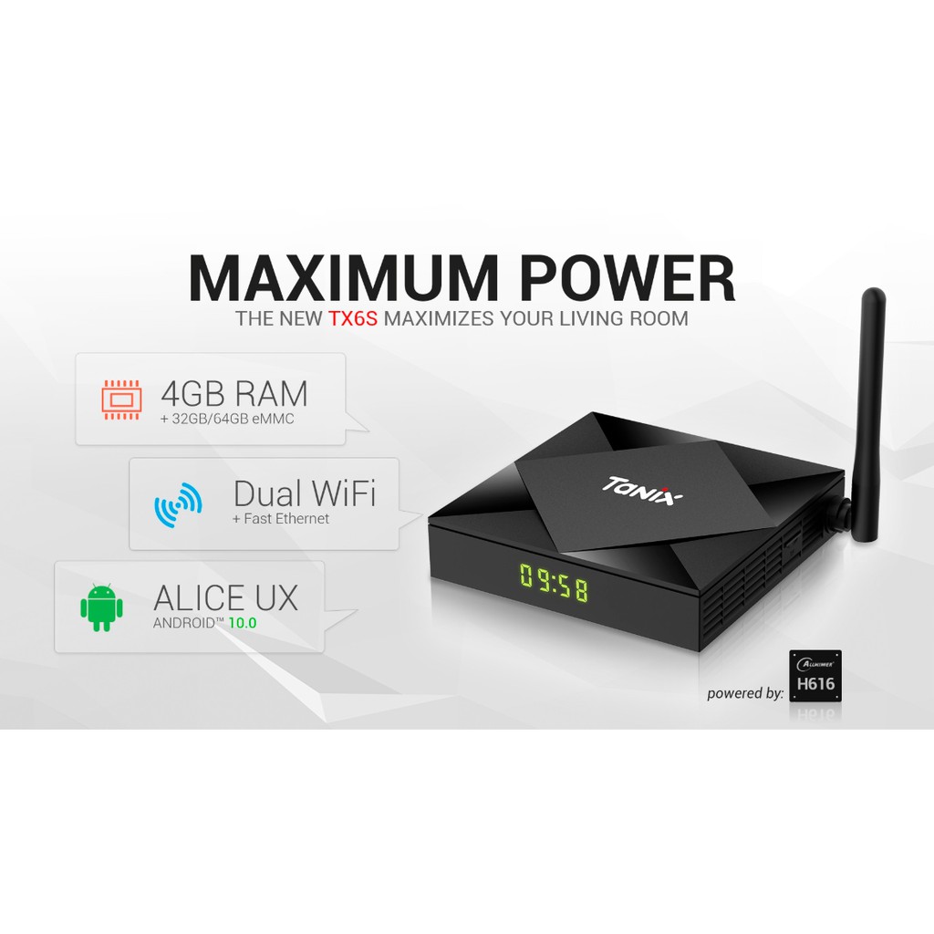 - Cấu hình mạnh mẽ với chip Allwinner H616 (phiên bản nâng cấp của Allwinner H6), ram 4gb, bộ nhớ trong 32gb, wifi chuẩn AC hai băng tần 2.4Ghz và 5.0Ghz, bluetooth 5.0 mới nhất.