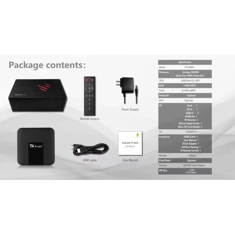 ➢ Android TV Box TX3 Mini Plus phiên bản mới 2022 có thiết kế giống các biến thể TX3 Mini trước đây, tuy nhiên phần cứng và hệ điều hành Android được nâng cấp CPU mới S905W2, hệ điều hành Android TV 11.➢ Phiên bản TX3 mini Plus với CPU thế hệ mới Amlogic S905W2 và Android TV 11 hỗ trợ chuẩn định dạng AV1.