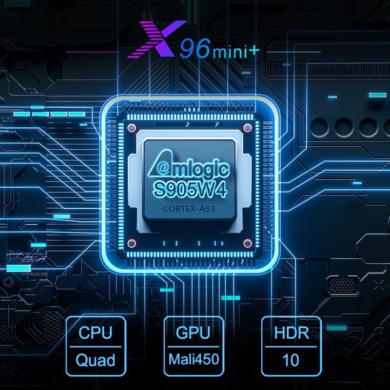 - X96 mini plus là Android TV Box đầu tiên sử dụng vi xử lý S905W4 mới và mạnh mẽ đến từ thương hiệu chip danh tiếng Amlogic. Hiệu năng mạnh mẽ hơn nhiều so với thế hệ chip phổ biến S905W trên các Android TV Box đã làm mưa làm gió tại thị trường Việt Nam như TX3 mini, X96 mini...