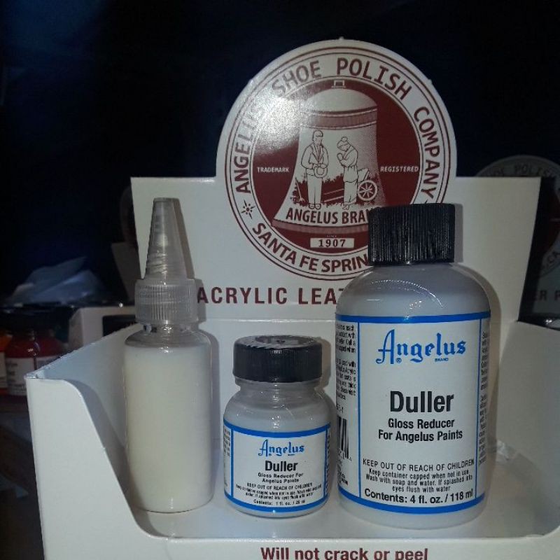 Angelus Duller được trộn với Angelus Paint để giảm lượng bóng trong sơn. Kết thúc hoàn hảo nếu bạn muốn bề mặt mờ hoặc bóng. Không quá 5-8% vào dung dịch sơn của bạn.Duller cũng hoạt động tốt khi trộn với Angelus Acrylic Finisher .