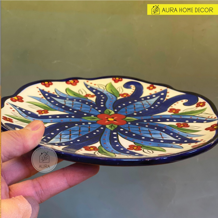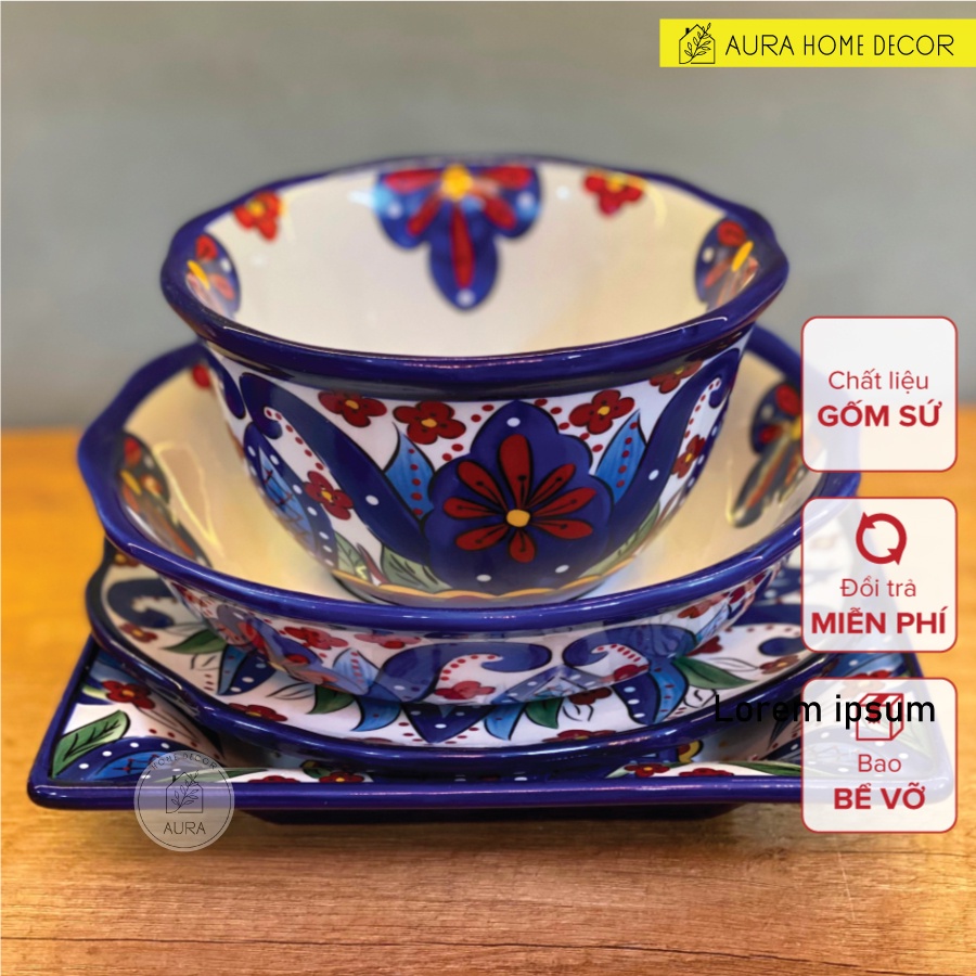 [ẢNH THẬT 100%] Tô mì, đĩa tròn, đĩa vuông gốm mỹ nghệ vẽ tay - Họa tiết thổ cẩm nền xanh cô ban sang chảnh