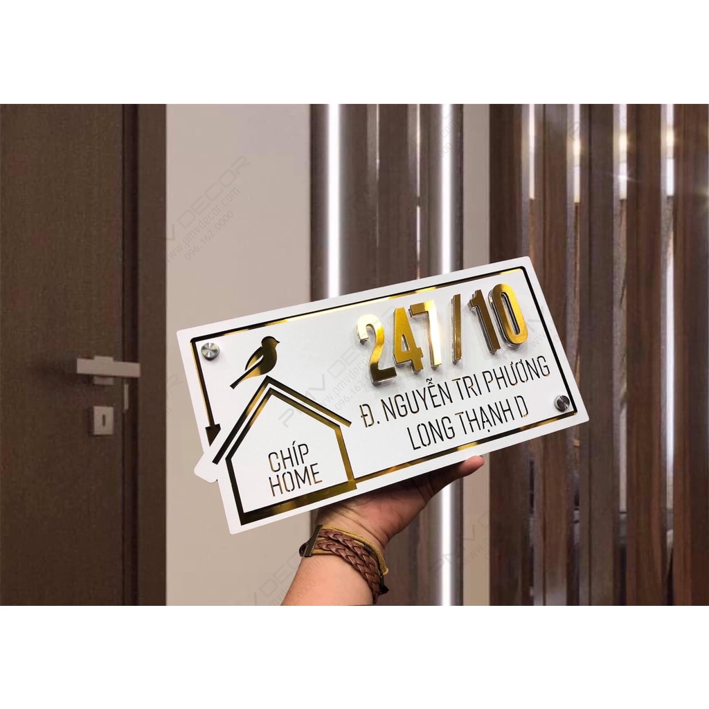 [Ảnh thật] BẢNG, BIỂN SỐ NHÀ. Alcorest Vàng gương + Mica trắng sần, số nổi 10mm, ngoài trời. BSN-PMV192
