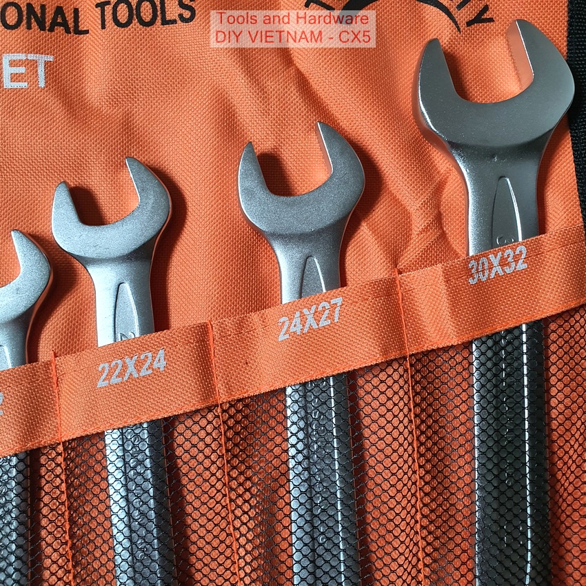 • Quy cách: cờ lê 2 đầu mở gồm 10 chi tiết là 6x7, 8x10, 10s12, 12x14, 14x17, 17x19, 19x22, 22x24, 24x27, 30x32