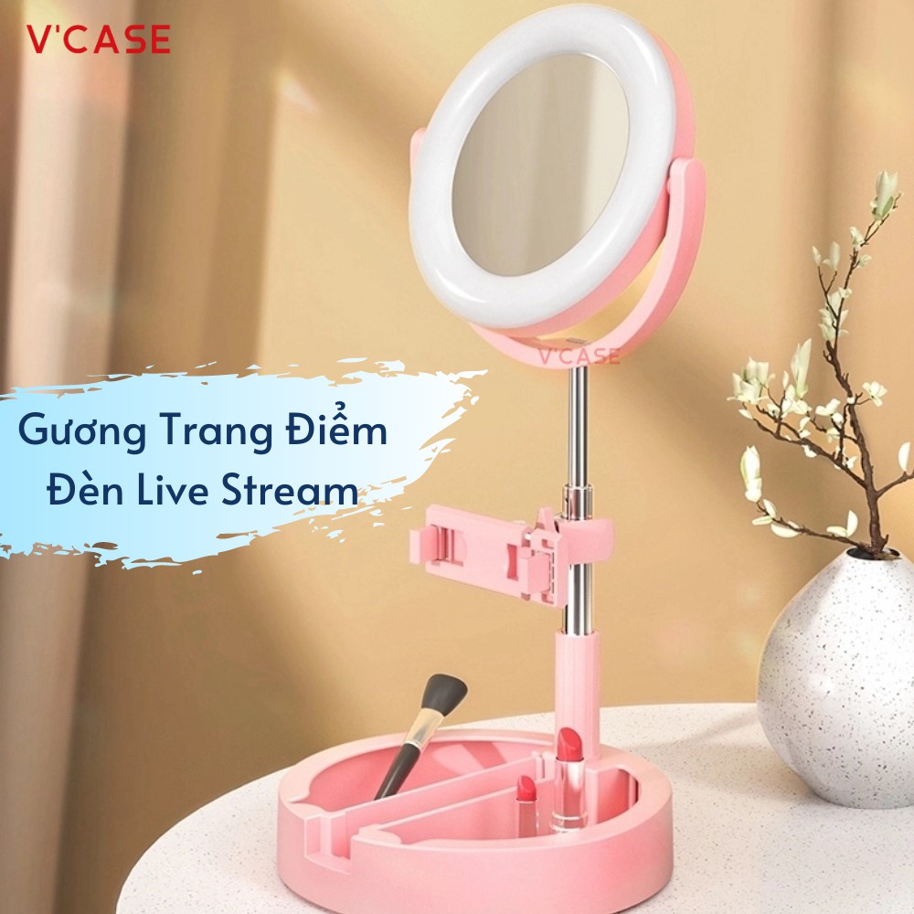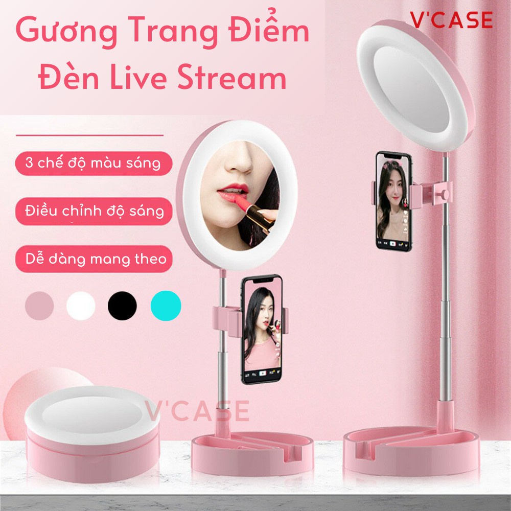 (ẢNH THẬT) Gương Tròn Trang Điểm Có Đèn Led Trợ Sáng, ĐÈN LIVE, 3 Màu, Tăng Giảm Chiều Cao, Gấp Gọn, Livestream, Tiktok,