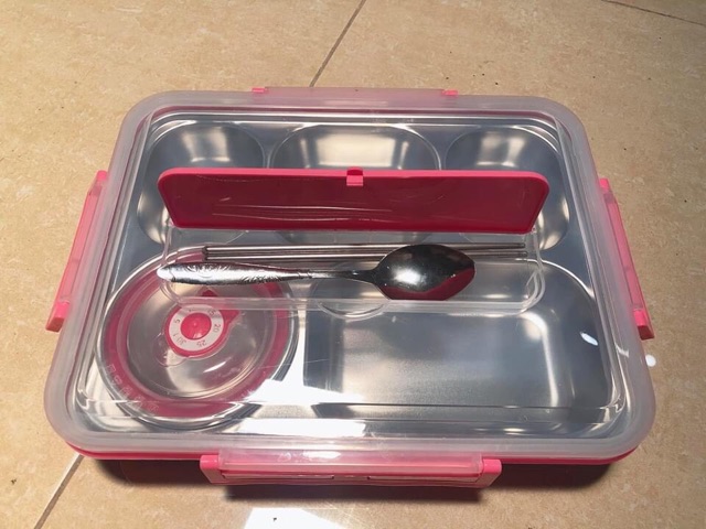 👉 3 ngăn nhỏ + 1 ngăn to + 1 ngăn đựng kèm bát đựng canh inox có nắp kèm theo cực tiện.