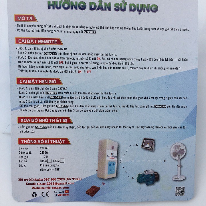 MÔ TẢThiết bị điều khiển tắt/ mở từ xa bằng remote , học được lệnh tất cả các remote có tầng số lớn 433Hz và hẹn giờ tắt mở theo ý muốn.