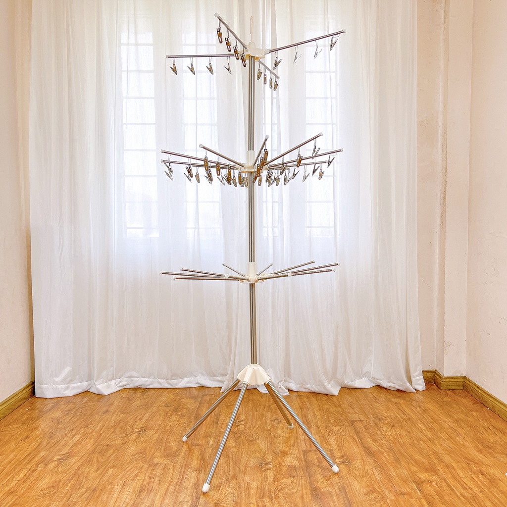 - Cây phơi quần áo 3 tầng với 3 giá phơi đồ cực kì chắc chắn và tiện dụng, có thể gập gọn khi không sử dụng, móc trùm có thể tháo rời làm 1 móc treo khác biệt. Sản phẩm có kích thước gọn nhẹ, giúp bạn dễ dàng di chuyển khi cần thiết.