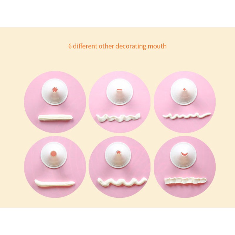 Sản phẩm bao gồm: 1 ống bơm, 12 miếng tạo hình, 6 đuôi bóp kem trang trí