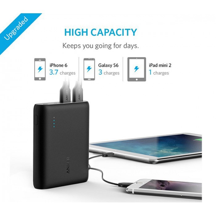 Đủ năng lượng cho nhiều ngày làm việc. Sạc iPhone 6 được 3,7 lần, iPhone 6 Plus, Galaxy S6 được 3 lần, iPad Air sạc được 1 lần