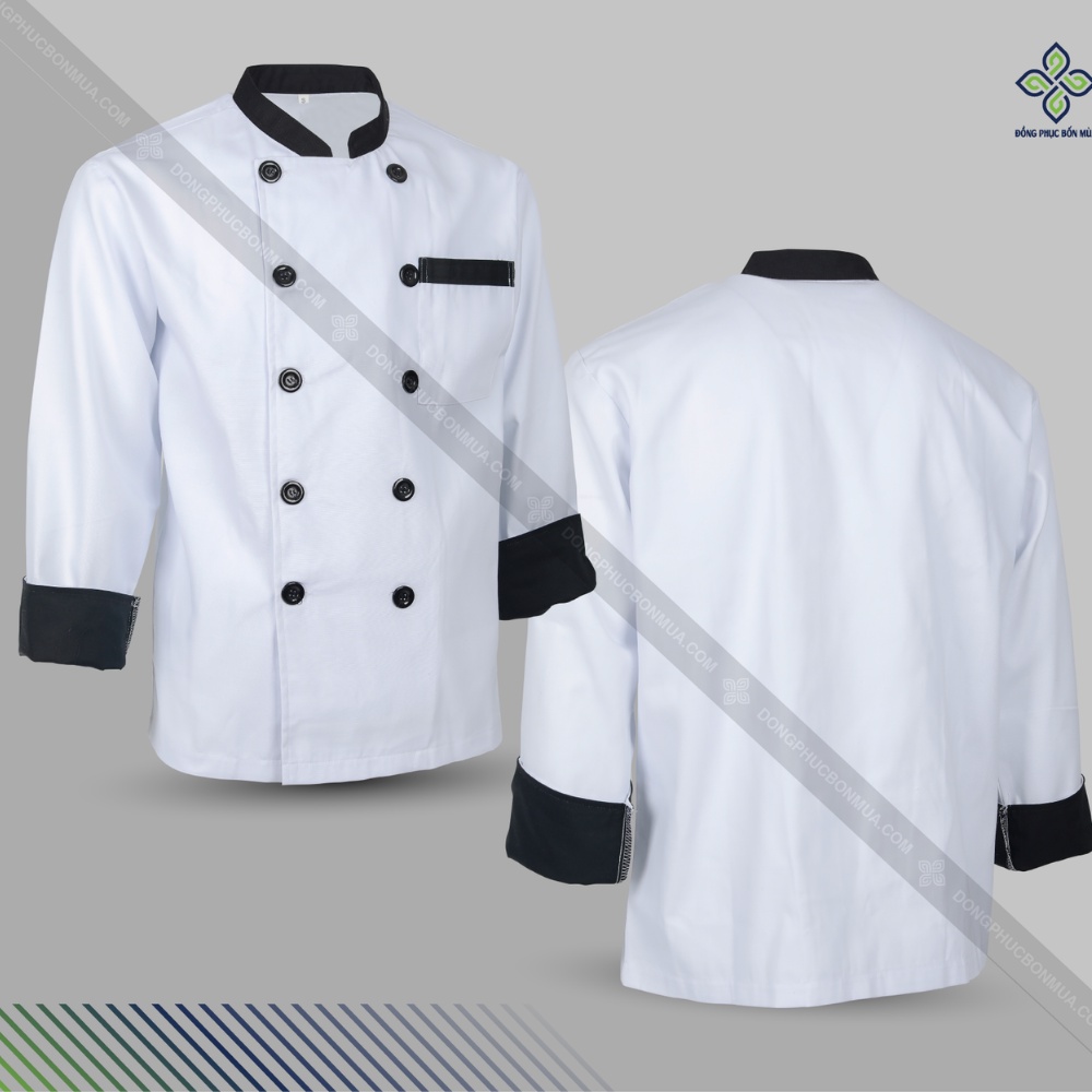 Quy cách: Áo bếp tay ngắn kaki cao cấp, hai dãy khuy cài, cổ tàu, phối viền. Có 1 túi trước ngực trái