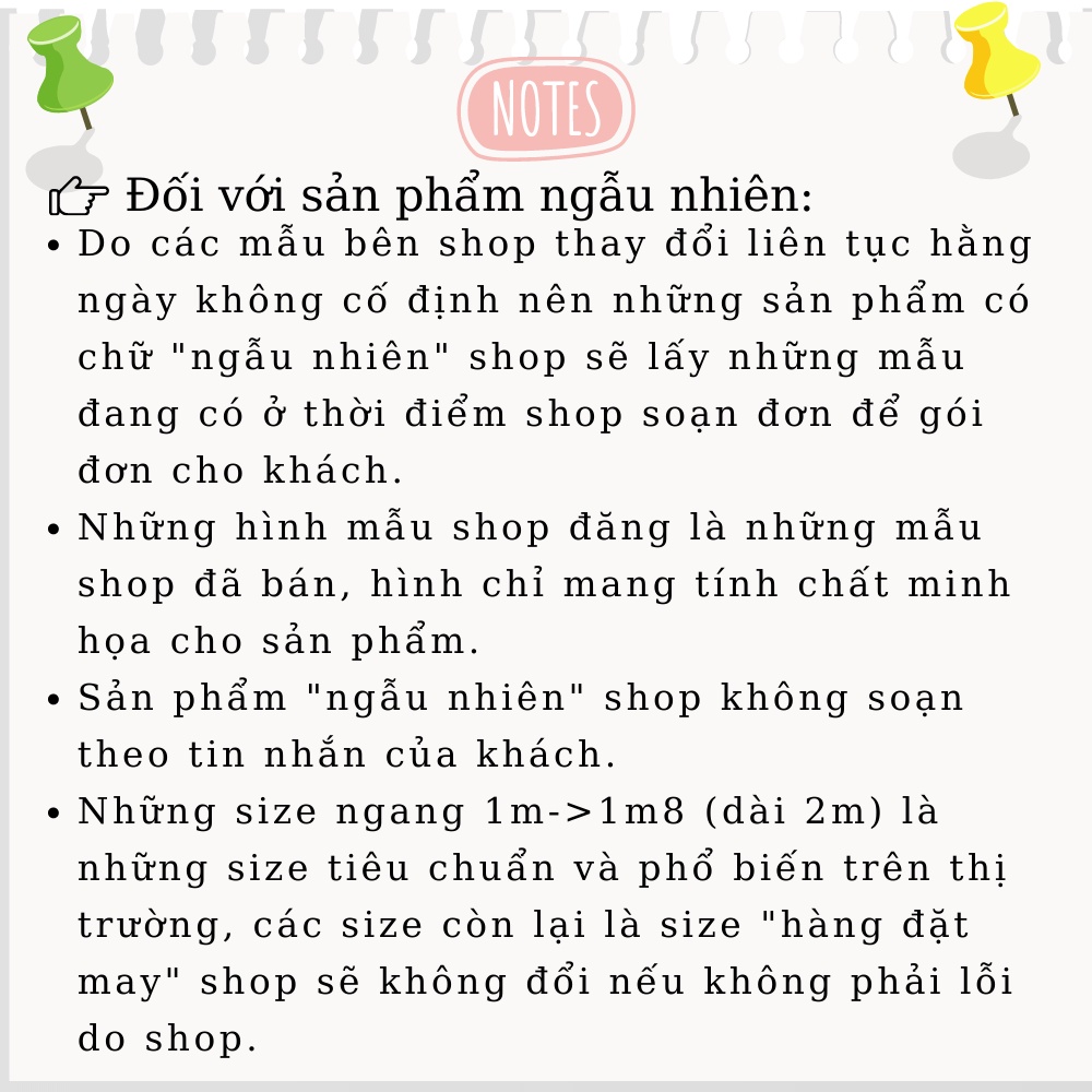 * Những size 1m->1m8 là size cơ bản, các size khác là size đặt may, shop sẽ không chấp nhận đổi nếu không phải lỗi do shop.
