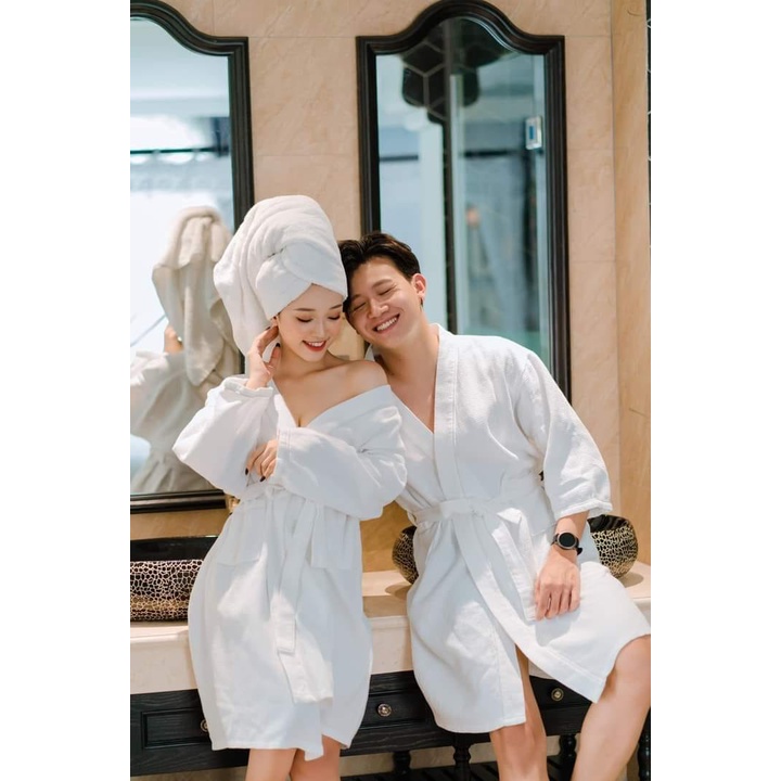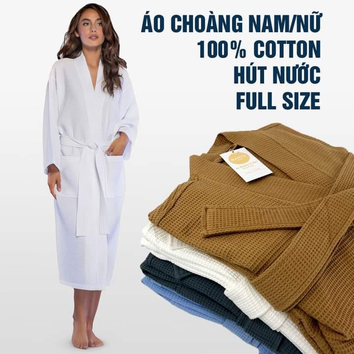 Áo Choàng Tắm, Áo Choàng Ngủ Cao Cấp 100% Cotton Dùng Trong Khách Sạn, Nhà Nghỉ, Spa, Đi Biển, Đi NgủÁo choàng tắm được làm từ chất liệu 100% Cotton waffle. Waffle là chất liệu cotton cổ điển, dạng tổ ong vừa sang trọng nhưng không kém phần mềm mịn, tăng diện tích thấm hút nước, tạo cảm giác thông thoáng, thoải mái vào mùa hè và giữ được độ ấm vào mùa đông. Sợi bông được xén gọn mịn màng tạo cảm giác cực kỳ thoải mái cho người sử dụng.