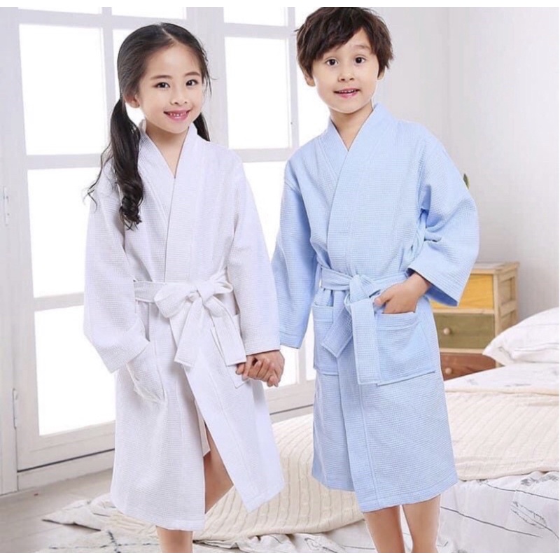 Áo choàng tắm cho bé nam, bé nữ từ 4 tuổi trở lên, chất vải tổ ong thoáng mát, mềm mịn không gây khó chịu khi mặc.Áo choàng tắm được làm từ chất liệu 100% cotton waffle. Waffle là chất liệu cotton cổ điển, dạng tổ ong vừa sang tròn nhưng không kém phần mềm mịn, tăng diện tích thấm hút nước, tạo cảm giác thông thoáng thoải mái vào mùa hè và giữ được độ ấm vào mùa đông.