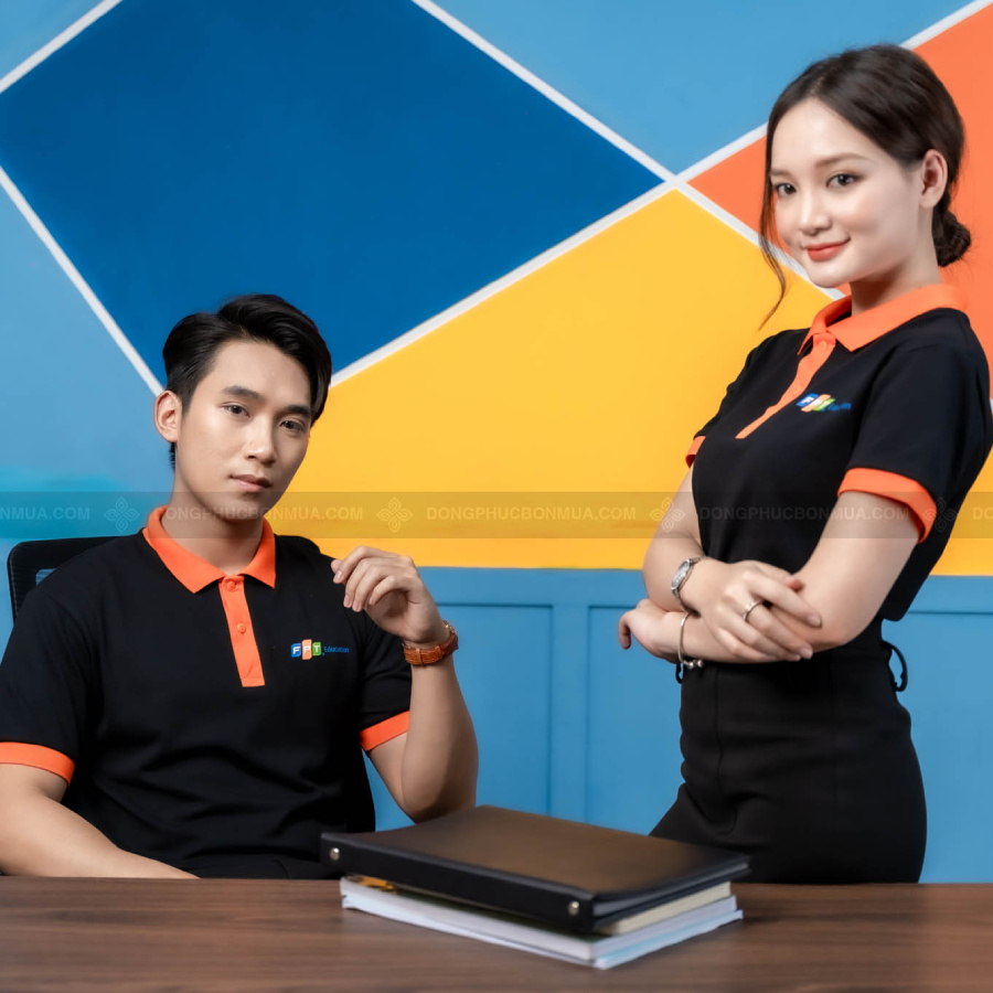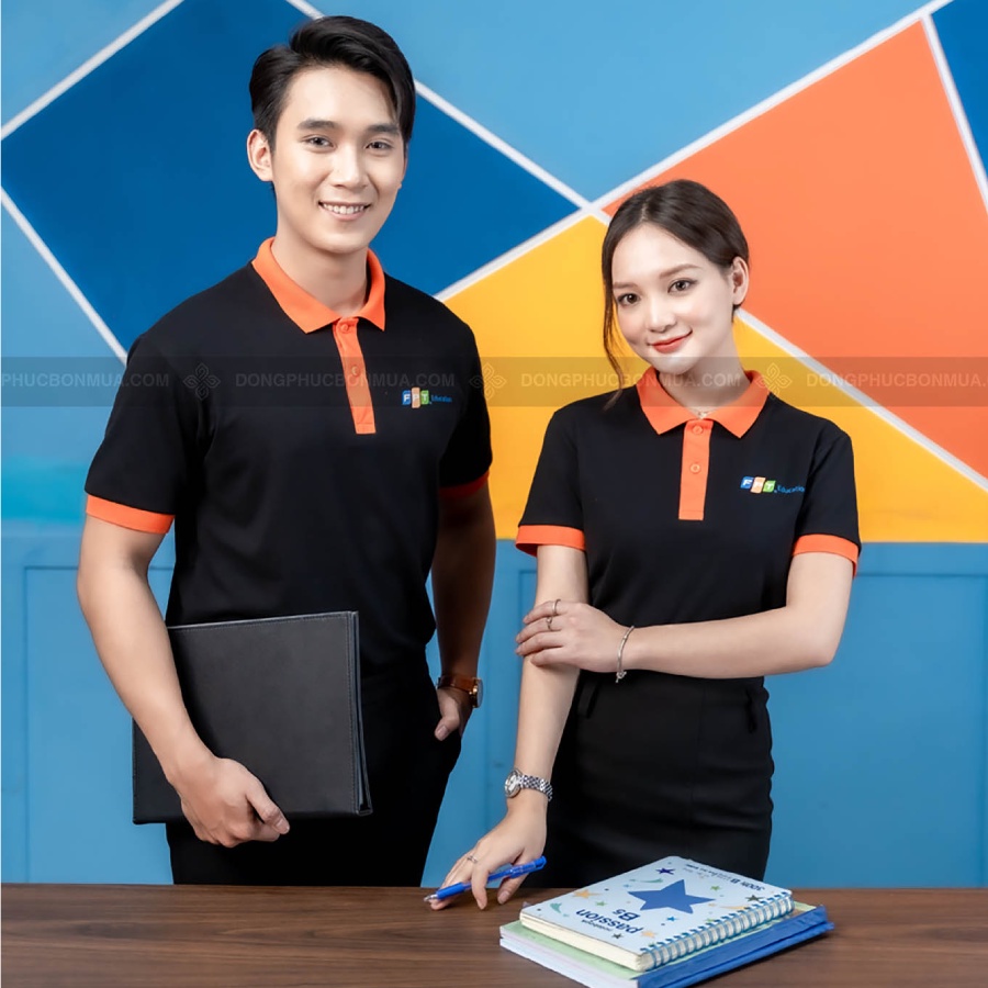 Giới thiệu Áo Đồng Phục Doanh Nghiệp Màu Đen Phối Cổ Cam Cotton, Lascote Co Giãn, Thấm Hút Mồ Hồi