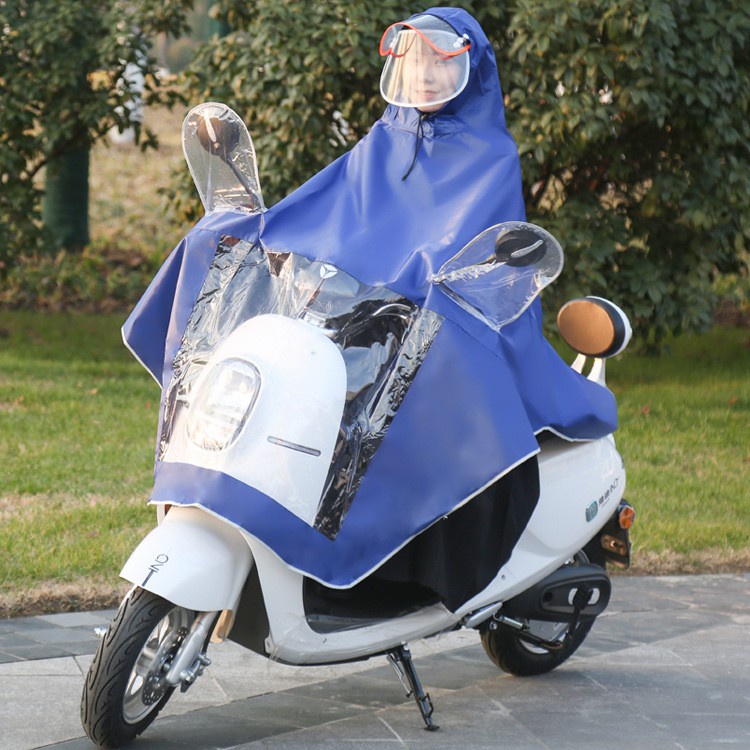 - Áo mưa có kính che mặt, che 2 gương, có phần bóng kính để che đèn xe máy.