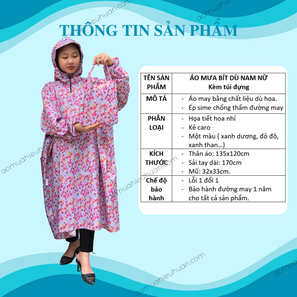 - Tên sản phẩm : Áo Mưa 1 Người Vải Dù Kín Không Xẻ Tà (BÍT BÔNG), Áo Mưa Thời Trang.- Kích thước toàn áo cả mũ (140x120) cm, sải tay dài 170cm, kích thước mũ (32 x33) cm.