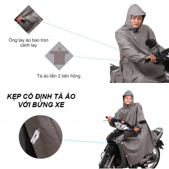 -Áo mưa COSY được thiết kế liền 2 bên hông giúp người di chuyển trong mưa an toàn và che kín toàn thân. Tà áo được trang bị kẹp gài để chùm kín phần bửng xe máy giúp hạn chế ướt ống quần khi điều khiển xe trong mưa.