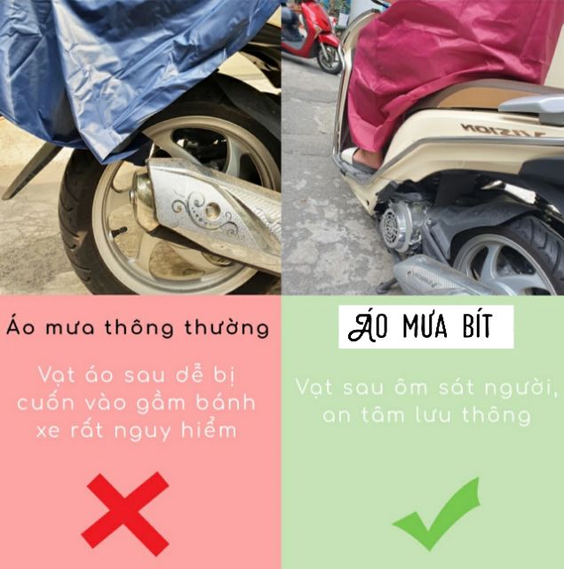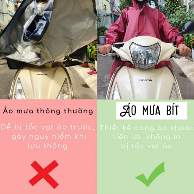 Khắc phục được nhược điểm của loại Áo mưa cánh dơi (Áo Poncho, hay là loại áo mưa xẻ tà), thường vì xẻ tà mà bị tạt ướt 2 bên hông. Sản phẩm áo mưa bít trùm cực kỳ tiện dụng khi bạn đi ra đường, và khi chỉ điều khiển xe máy một mình.