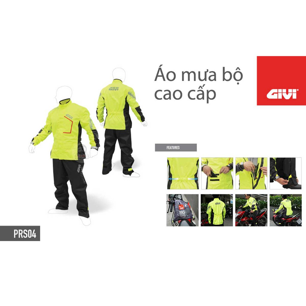 Thời tiết nước ta đã bắt đầu bước vào những tháng cuối năm với nhiều hơn những cơn mưa bất chợt và ảnh hưởng từ những cơn bão, áp thấp ngoài khơi. Vì vậy, những bộ áo mưa sẽ là trang bị hết sức cần thiết khi đi tour, đường xa, đặc biệt là đối với những anh em biker, phượt thủ. Hãng GIVI đã cho ra sản phẩm áo mưa & quần PRS04 để có thể đáp ứng những nhu cầu cao nhất của anh em.Với áo mưa bộ GIVI PRS04, mưa gió thất thường sẽ không còn là nỗi lo trong những chuyến đi phượt khám phá. Bộ áo mưa GIVI PRS04 có khả năng chống thấm nước dưới nhiều điều kiện mưa khác nhau cùng những tính năng tùy chỉnh, thiết kế tiện lợi hơn. Áo có màu xanh neon phản quang mang phong cách police châu Âu cực ngầu. GIVI thấu hiểu nhu cầu người dùng áo mưa sẽ khoác ngoài lớp áo khoác giáp bảo hộ nên size áo khá rộng và phù hợp. Bạn sẽ có thể hoàn toàn an tâm về chất lượng với số tiền bỏ ra