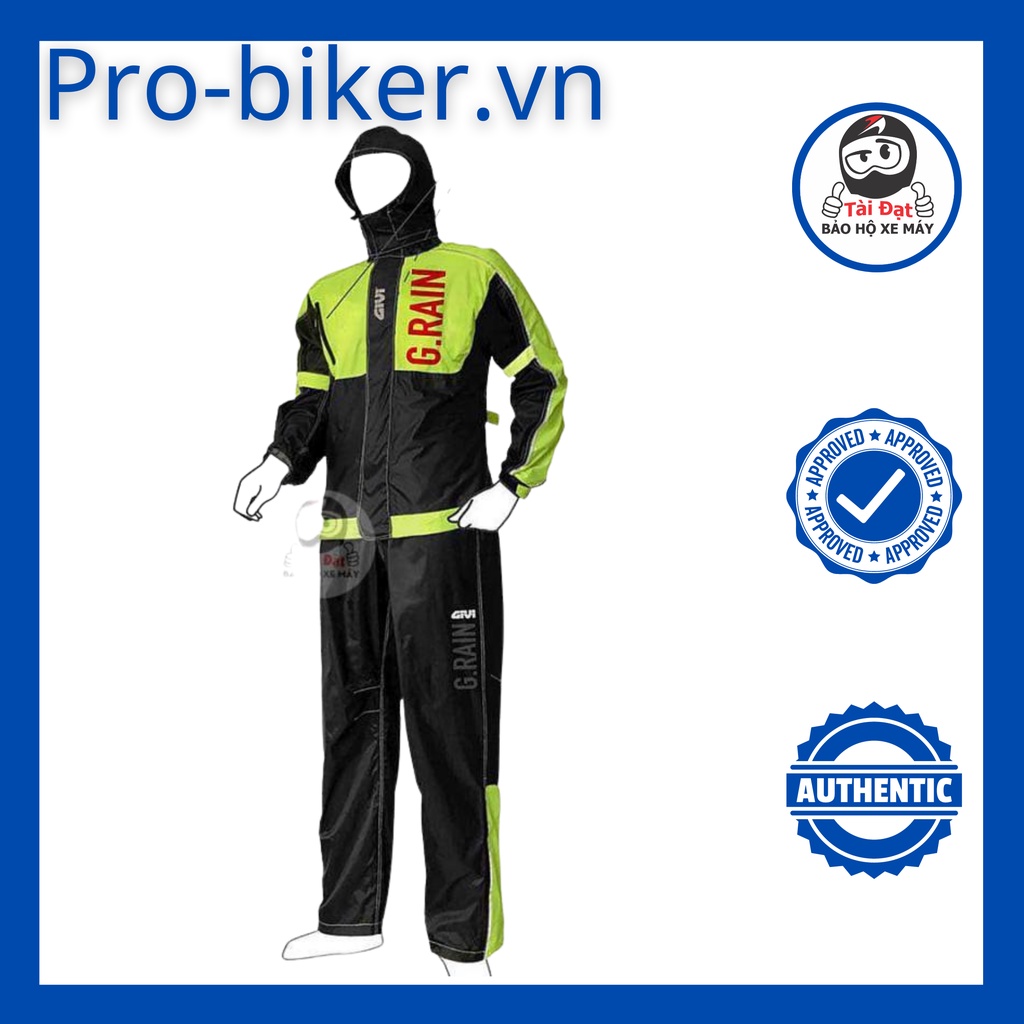 Cấu tạo Givi GRA01 G-RainÁo mưa bộ GIVI được sử dụng công nghệ may hiện đại nhất hiện nay với tiêu chuẩn chất lượng cao cấp châu Âu. Nhìn qua kiểu dáng sản phẩm, khách hàng sẽ nhanh chóng nhận ra sự kết hợp hài hòa giữa chất Ý với những đường cắt mạnh mẽ tạo nên nét riêng biệt của Givi GRA01. Cách phối màu gây ấn tượng cùng đen - vàng nổi bật, ngực áo chữ G-Rain màu đỏ nổi bật.