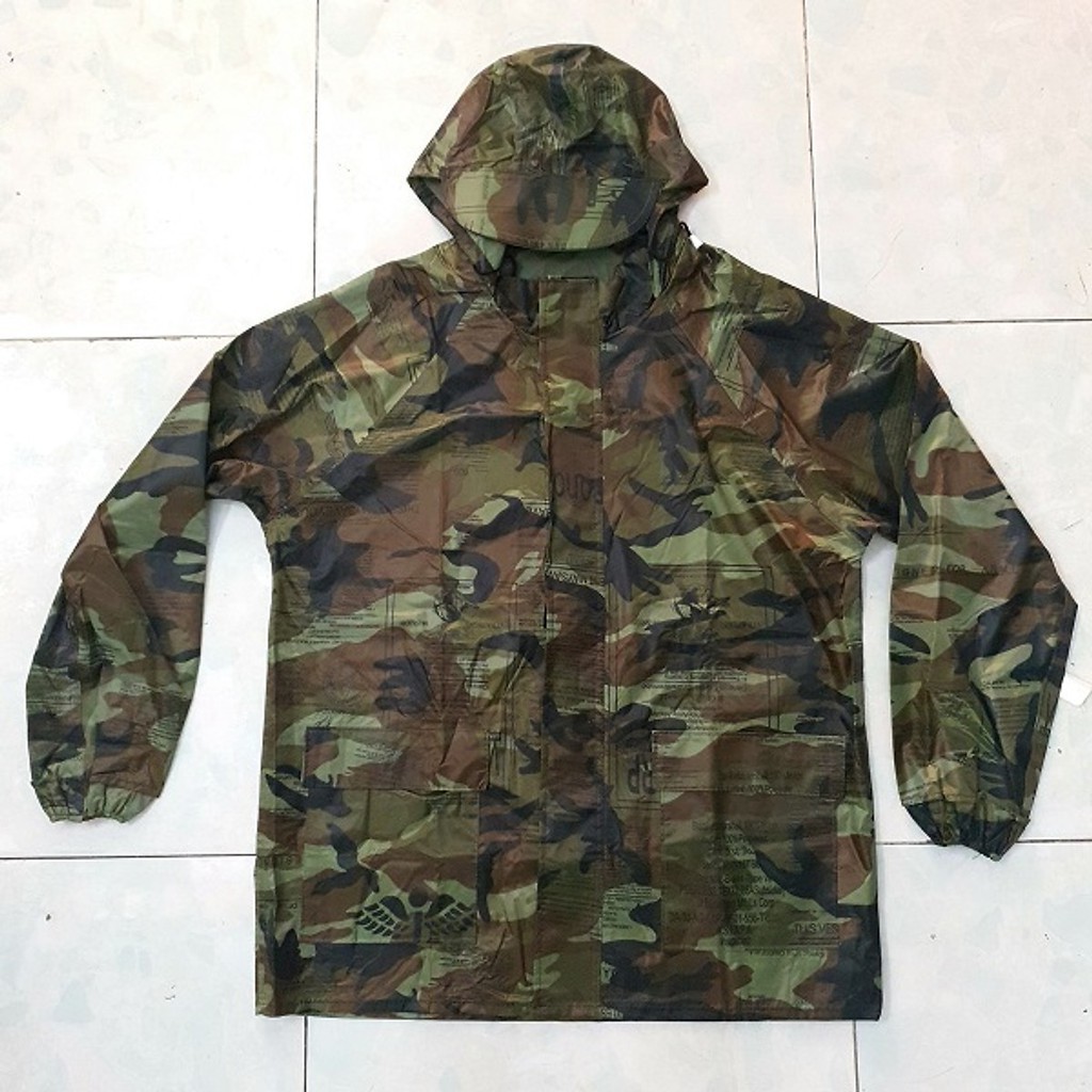 - Bộ gồm: Áo (khóa kéo và nút bóp), quần, nón (có thể tháo rời).