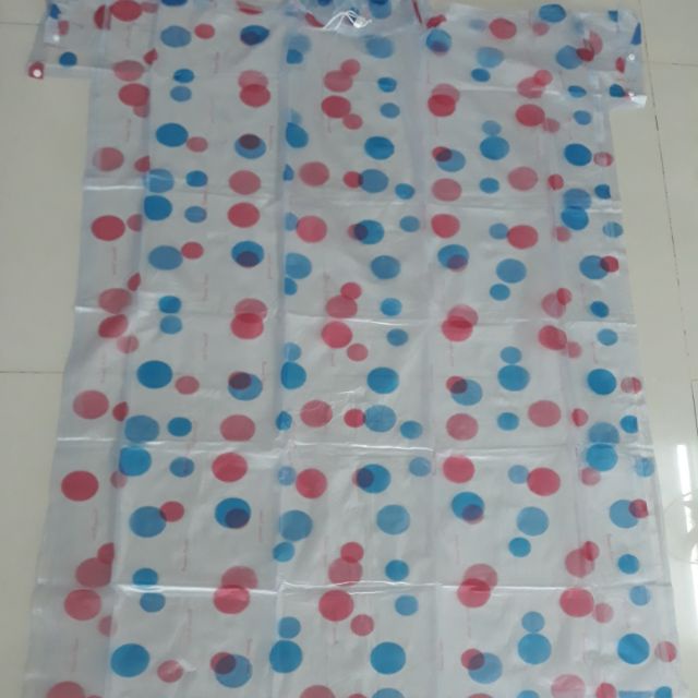 Áo mưa cánh dơi xẻ tà 2 bên có nút cài tiện lợi khi đi mưa, gió. chất liệu nhựa trong in hình quả bóng . Có 3 màu: tim-đỏ, xanh dương- đỏ, xanh lá - đỏ. Nón có kết nhựa, dây rút chắc chắn.
