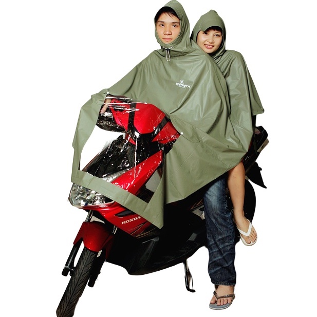 -Áo mưa có 2 mũ, kính che đèn và lỗ xỏ gương xe máy, thuận tiện cho 2 người cùng di chuyển khi trời mưa.