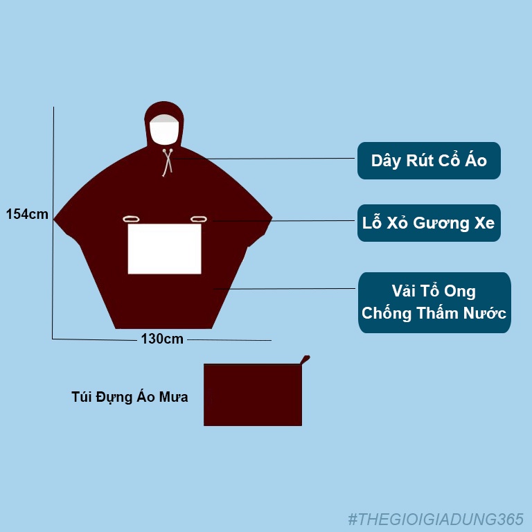 - Kích thước: 154cm x 130cm ( dài x rộng tính cả mũ)