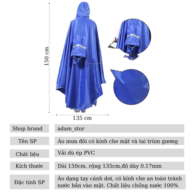 - Kích thước áo: chiều dài 1,5m (cả mũ) x 1,32m chiều rộng chỗ rộng nhất, độ dày 0,17mm.