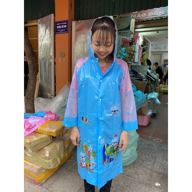 - Áo mưa rộng rãi, thoải mái. Dùng cho bé đi học, đi chơi rất tiện lợi và cực kỳ thời trang
