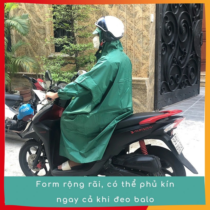 - Thiết kế kín người (áo mưa không xẻ tà) giúp hạn chế tối đa việc bị nước mưa tạt từ bên cạnh hông