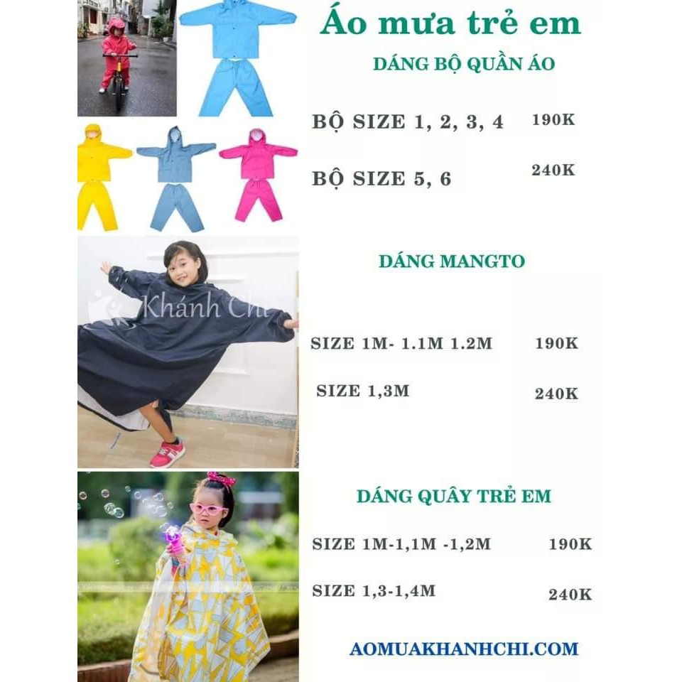 📌📌 Áo mưa KHÁNH CHI cung cấp sản phẩm áo mưa trẻ em với nhiều kích thước khác nhau,