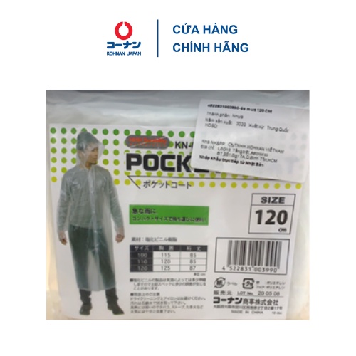 Tên sản phẩm :Áo mưa nhựa dẻo trong suốt KOHNAN 1 đầu Nhật Bản