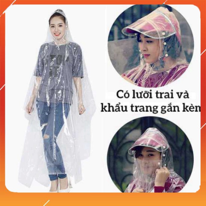 Áo mưa trong suốt 2 đầu độc đáo, khoe được những trang phục mặc bên trong.Có lưỡi trai và khẩu trang đính kèm.
