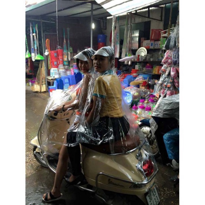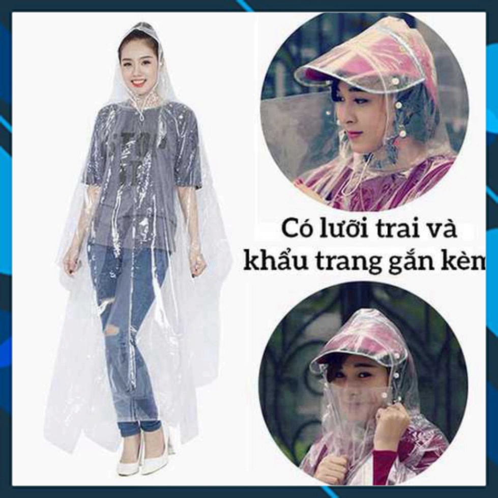 Áo mưa trong suốt 2 đầu độc đáo, khoe được những trang phục mặc bên trong.Có lưỡi trai và khẩu trang đính kèm.