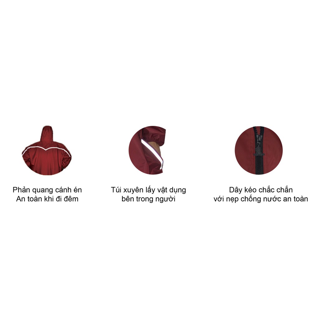 Được sản xuất với chất liệu Nylon/PVC cao cấp, không co dãn, không thấm ướt, mặt vải mịn với độ trượt nước nhanh, sản phẩm sử dụng bền bỉ. Với thiết kế đa năng dạng áo khoác với sự kết hợp dây keo bên trong và nút gài bên ngoài nhằm giúp che mưa tối đa cho người sử dụng