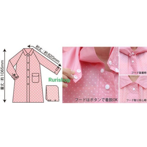 - Công dụng: Áo mưa mỏng nhẹ mang lại cảm giác thoải mái cho người dùng. Dạng cúc bấm ở giữa giúp người dùng thoải mái, thay ra thay vào mà không làm mái tóc của bạn rối tung lên.