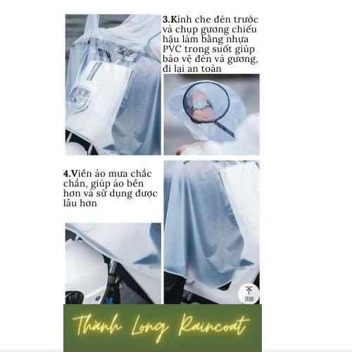 - Mặt trước của áo mưa có phần bóng kính trong suốt dành riêng cho đèn xe tiện dụng khi chạy vào ban đêm
