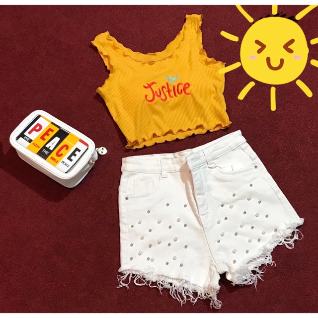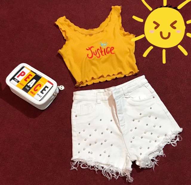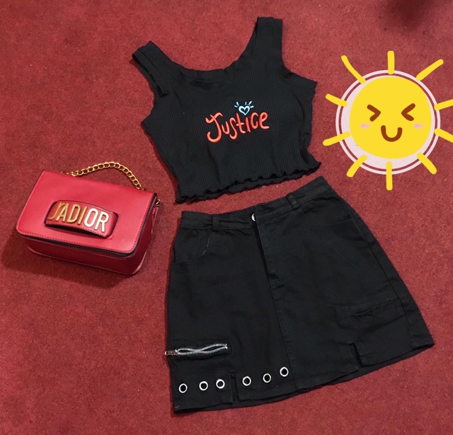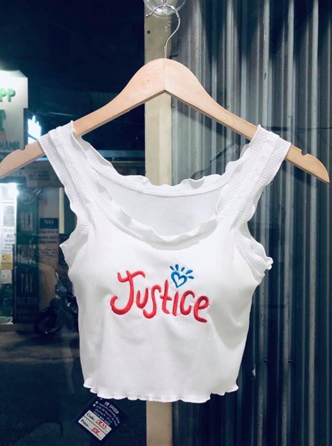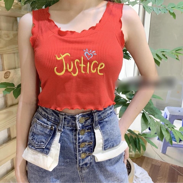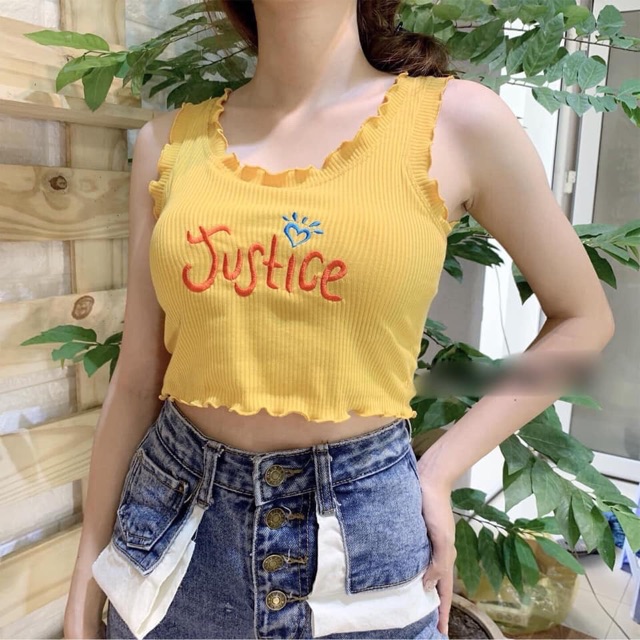 Áo croptop thêu chữ Justice cuốn biên xịn xò ☘️Chất thun tăm cao cấp, co giãn tốt, thấm hút mồ hôi 🍀