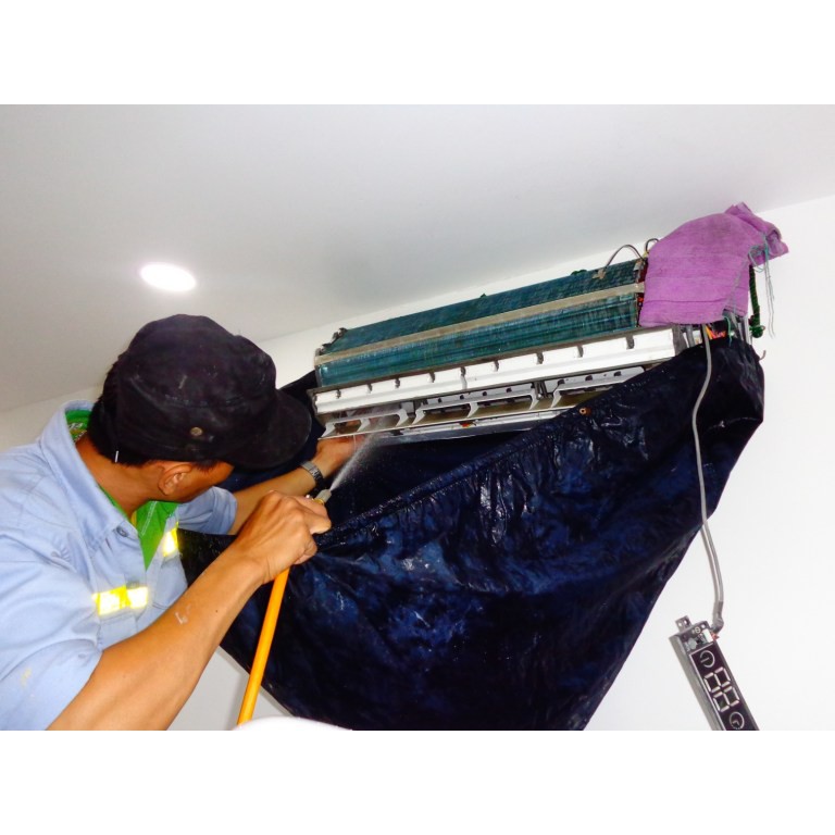 Sử dụng dây luồn trên miệng áo vệ sinh có thung co giản, sau đó treo áo vệ sinh trùm phía dưới máy lạnh, kéo miệng áo ra phía ngoài và đưa vòi xịt vào, nước và bụi bẫn sẽ theo đường ống đi vào xô đặt phía dưới.