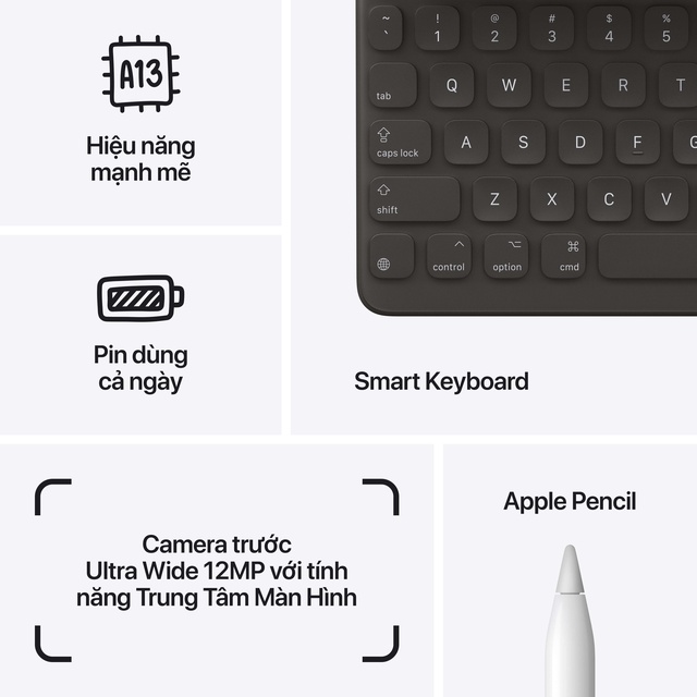 • Tương thích với Apple Pencil (thế hệ thứ 1) và Smart Keyboard (1)
