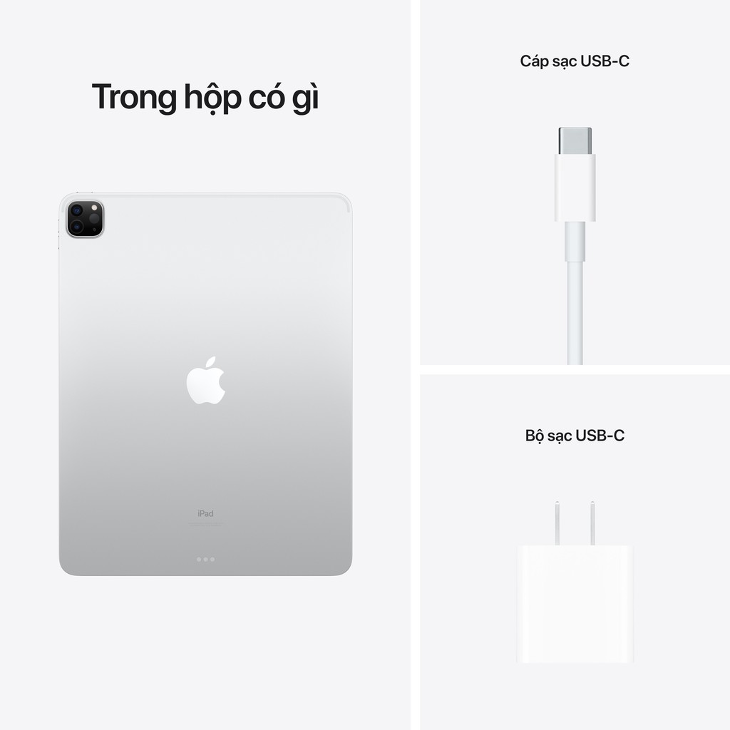 Trong hộp gồm : iPad Pro 12.9 2021 M1 Wi-Fi 128GB, sách hướng dẫn, cáp sạc, cốc sạc.