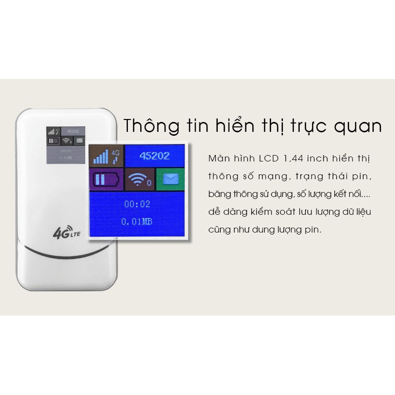 - Thông tin hiển thị trực quan, Màn hình LCD 1,44 inch hiển thị thông số mạng, trạng thái pin, băng thông sử dụng, số lượng kết nối, dễ dàng kiểm soát lưu lượng dữ liệu cũng như dung lượng pin.